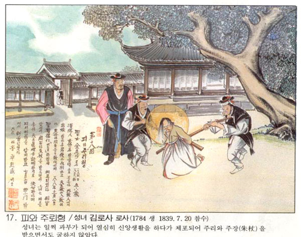 | Çѱ¹ õÁÖ±³È¸ÀÇ 103¸íÀÇ ¼ºÀÎÁß ÇÑ»ç¶÷.°úºÎ°¡ µÈ µÚ ÀÔ±³ÇÏ¿© ¿½ÉÇÑ ½Å¾Ó »ýȰ·Î Ä£Á¤ ½Ä±¸µéÀ» ÀÔ±³½ÃŲ ±è ·Î»ç´Â 1839³â 1¿ù 16ÀÏ ±ÇµæÀÎ(ÏíÔðìÒ) µî°ú ÇÔ²² üÆ÷µÇ¾ú´Ù. Æ÷û°ú ÇüÁ¶¿¡¼ ½Å¹®À» ¹ÞÀ» ¶§ ¡°ÇÏ´À´ÔÀº ½ÅÀθ¸¹°(ãêìÑØ¿Úª)ÀÇ Å« ÁÖÀÎÀ̽öó ¹è¹ÝÇÒ ¼ö ¾ø½À´Ï´Ù." Çϸç ÀÚ½ÅÀÇ ¶æÀ» ºÐ¸íÈ÷ ¹àÈ÷°í, ¿©·¯ ...